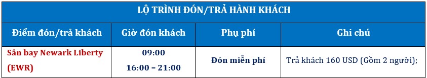 Buổi sáng: Xe đón Quý khách tại sân bay Newark Liberty (EWR) vào lúc 09:00 sáng (giờ đón khách là thời gian sau khi khách đã nhận xong hành lí – nếu khách vừa đáp tại sân bay), hướng dẫn viên đón khách tại sân bay. Nếu quý khách có nhu cầu tham quan trong thành phố ngay khi xuống sân bay thì đăng ký tour buổi sáng New York ngay khi đặt tour.
