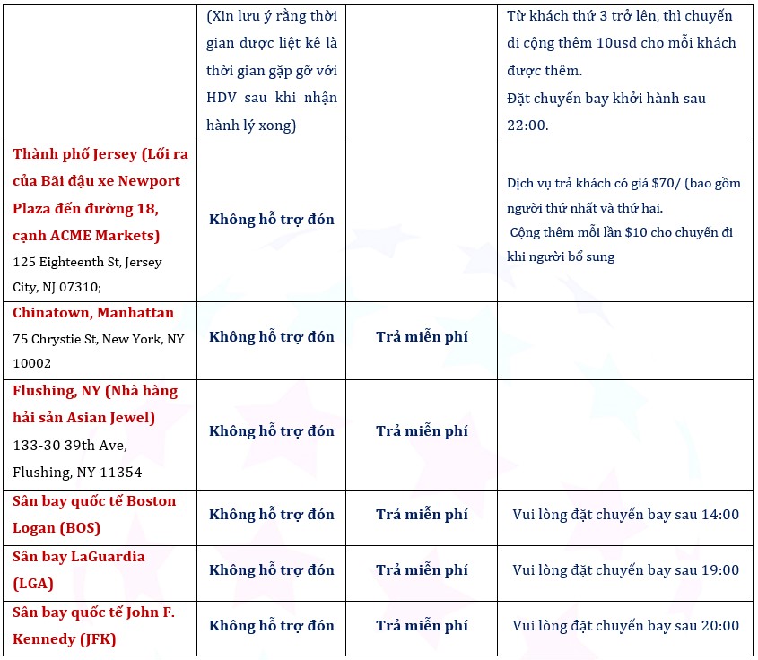 HÀNH TRÌNH Khách sạn → Chuyến tham quan khám phá nước Mỹ đầu tiên (3 giờ) → Chợ Quincy + Bữa ăn tôm hùm Boston (Bữa ăn tôm hùm tùy chọn, 70 phút) → Trả khách tại Sân bay BOS → Trả khách tại Sân bay NYC |