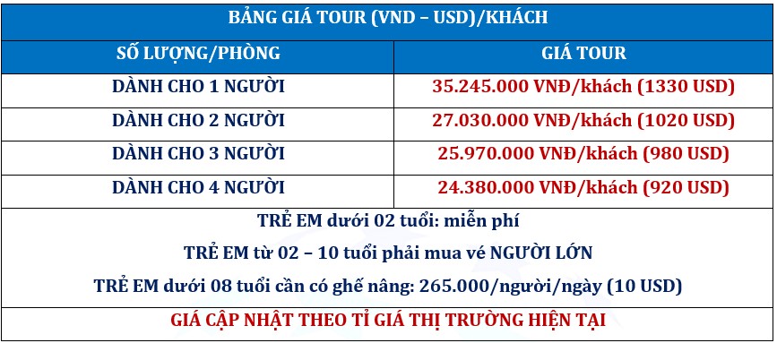 - Tiền tip: 15 USD/người/ngày, bất kỳ trẻ em và trẻ sơ sinh nào sử dụng ghế ngồi trên xe cũng phải trả tiền tip.