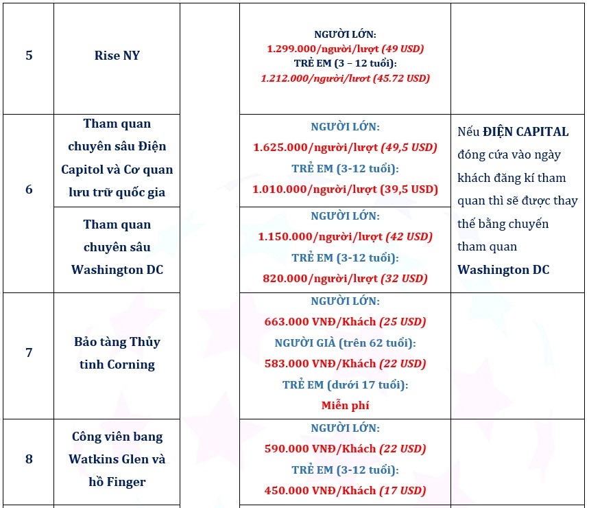 - Trong trường hợp khách hàng đăng ký tour đồng thời làm dịch vụ visa Mỹ do Công ty hỗ trợ và kết quả đậu visa Mỹ, mà không thể tham gia tour, Quý khách vui lòng mang Biên bản đăng ký tour & biên lai đóng tiền đến văn phòng công ty để làm thủ tục hủy tour căn cứ theo điều kiện tour huỷ phạt như trên và xem xét chuyển đổi thành dịch vụ visa lẻ với chi phí là: 12.900.000 vnđ (bao gồm phí phỏng vấn visa của LSQ Mỹ + thư mời) hoặc huỷ visa. Phải thông báo cho Công ty bằng văn bản hoặc email (không giải quyết các trường hợp liên hệ chuyển/ hủy tour qua điện thoại).