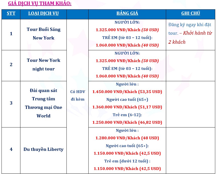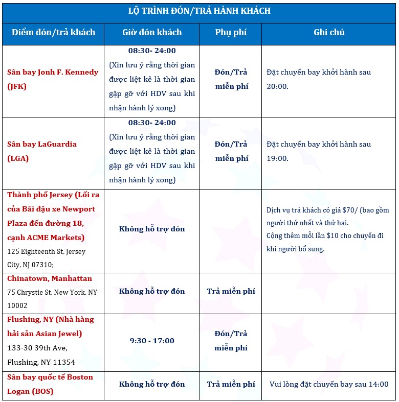 Lưu ý: Đối với các tour khởi hành từ 06/05/2025 - 06/10/2025 và 21/08/2025 – 15/09/2025, Quý khách sẽ được sắp xếp lưu trú tại The Heldrich Hotel & Conference Center hoặc Holiday Inn South Plainfield-Piscataway hoặc Holiday Inn Newark International Airport hoặc khách sạn hạng tương tự vào ngày đầu tiên. Vé miễn phí đến Liberty Cruise và One World Observatory Deck sẽ được tặng cho hai khách đầu tiên may mắn trong mỗi phòng.
