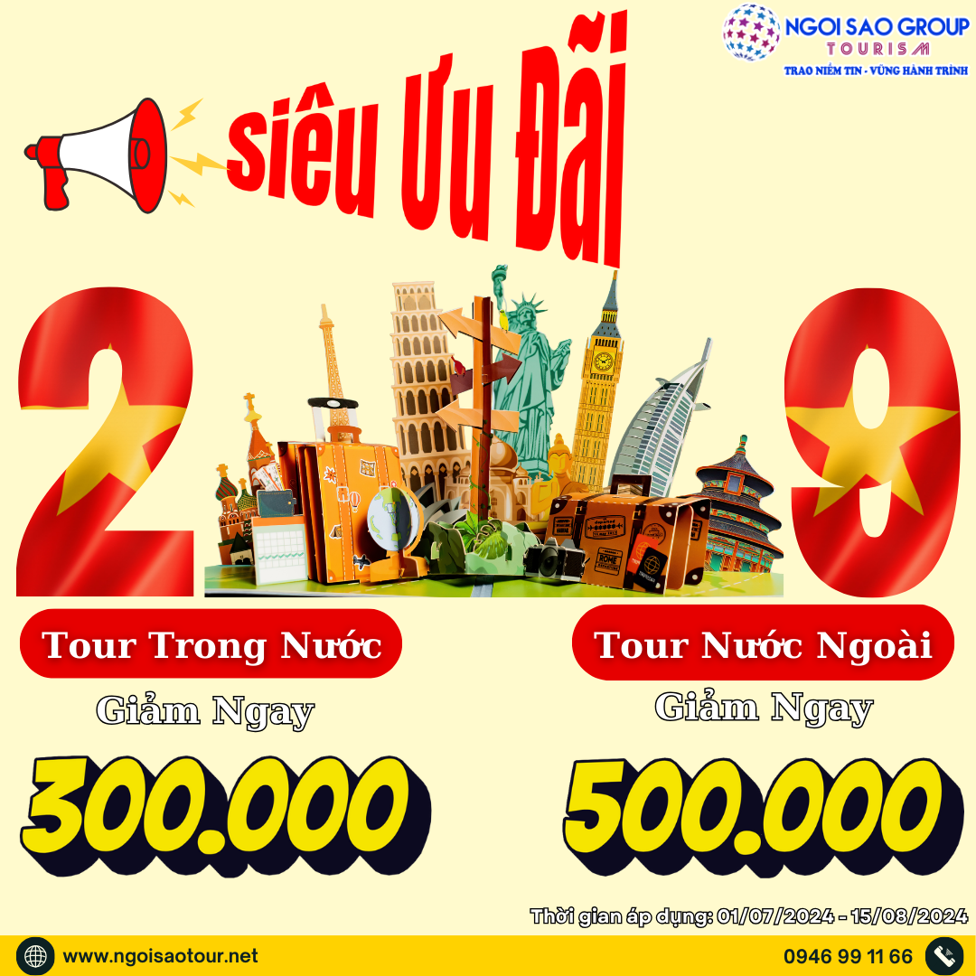 Còn gì tuyệt vời hơn khi được khám phá những miền đất mới, tận hưởng những trải nghiệm độc đáo trong kỳ nghỉ lễ Quốc khánh 2/9 sắp tới? Nắm bắt cơ hội vàng này, Ngôi Sao Tour hân hạnh mang đến chương trình ưu đãi "Du lịch 2/9 Khám Phá muôn nơi – Ngập tràn ưu đãi" với rất nhiều ưu đãi hấp dẫn như: