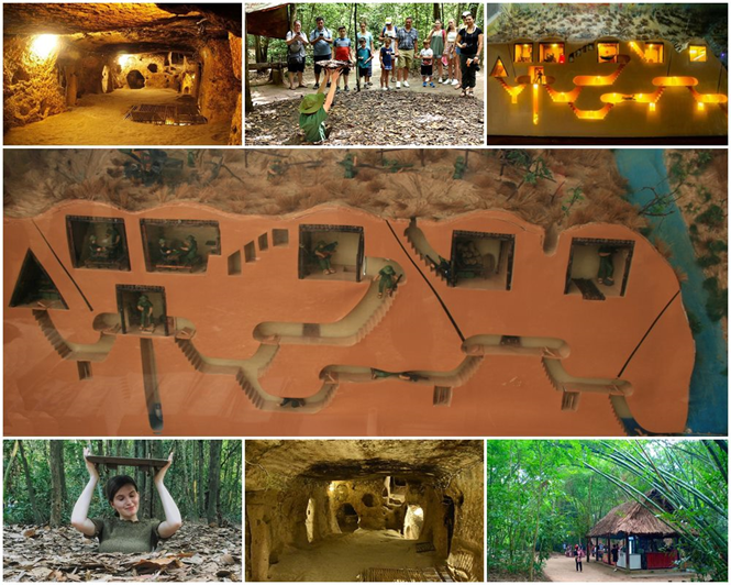 - Tận mắt chứng kiến hệ thống địa đạo ngoằn ngoèo, nơi từng là căn cứ bí mật của quân đội ta. Trải nghiệm bò trườn trong lòng địa đạo, tham quan các công trình bên trong như bếp Hoàng Cầm, phòng họp, bệnh xá, kho vũ khí… Tìm hiểu các loại vũ khí thô sơ, bẫy chông tự chế, cùng quá trình làm bánh tráng và rượu gạo truyền thống của người dân địa phương.