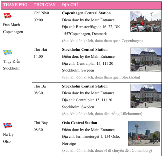 Lưu ý: Dịch vụ đưa đón tại sân bay và dịch vụ khách sạn trước/sau tour đều có ở Copenhagen, Oslo và Stockholm.