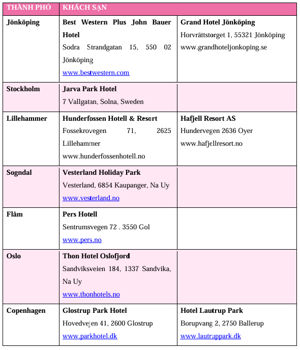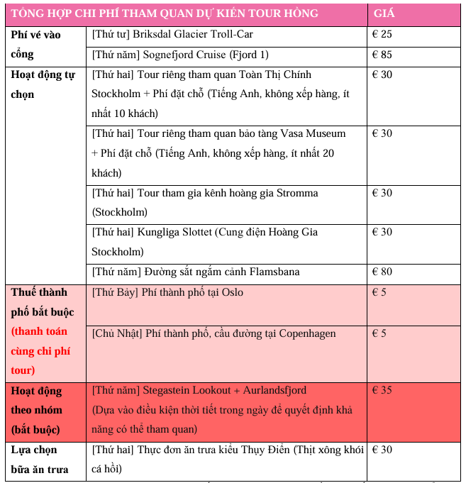 Lưu ý: Tuyến Hồng sẽ bị phụ thu thêm €15/người/đêm khi lưu trú vì mức sống của Scandinavia cao hơn với những nơi khác.