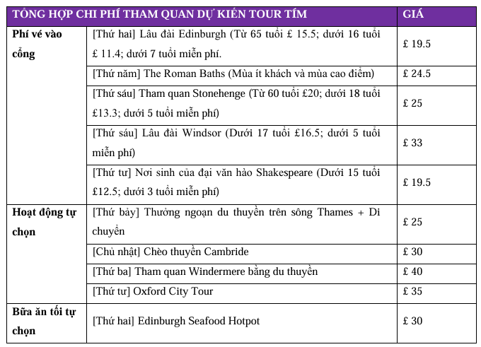 1. Tham quan nơi sinh của Shakespeare (dưới 15 tuổi £9.75, dưới 3 tuổi miễn phí): £19.5 2. Tham quan thành phố Oxford: £35