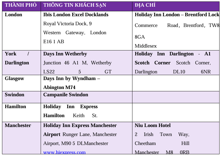 • Thông tin khách sạn sẽ được cung cấp 24 tiếng trước ngày check-in (bao gồm cả khách sạn trước và sau khi tham gia đoàn). Thông tin đối tác khách sạn chúng tôi thường hợp tác được liệt kê như bảng sau:
