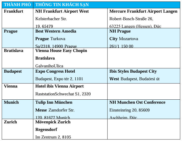 Khách sạn: 3* tại Frankfurt hay khu vực lân cận. (B) (dành cho khách tiếp tục đi tour hoặc lựa chọn dịch vụ khách sạn sau tour)
