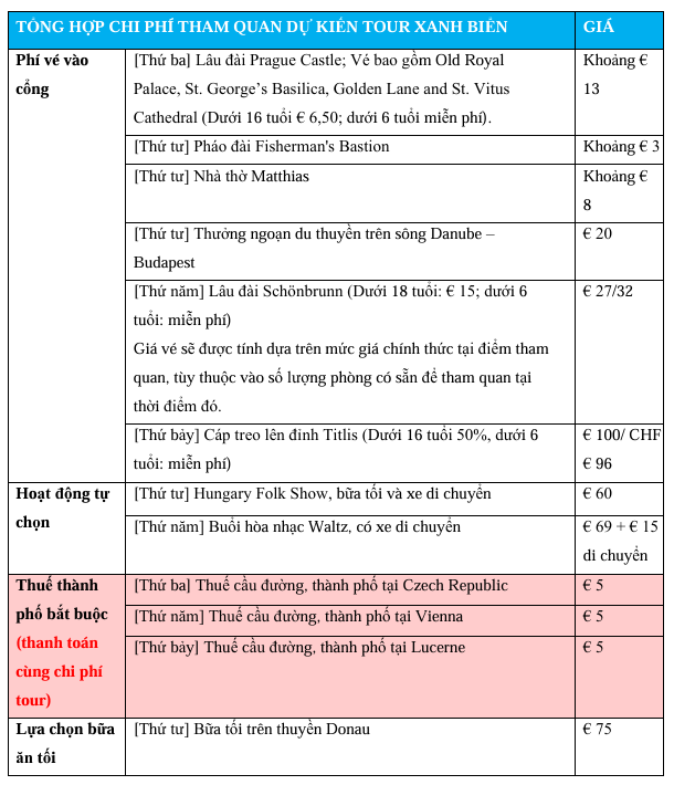 Lưu ý: Danh sách chi phí chỉ mang tính chất tham khảo, tùy thời điểm thực tế, giá sẽ thay đổi. Du khách vui lòng lưu ý rằng một số điểm tham quan phục vụ tùy thuộc vào số lượng khách tối thiểu và điều kiện địa phương. Hướng dẫn viên sẽ thông báo mỗi ngày theo từng hành trình, hỗ trợ du khách mua vé và thu phí trực tiếp bằng tiền mặt (Euro). Du khách có thể tự do quyết định mua vé tham quan hoặc các bữa ăn theo sở thích cá nhân. Việc tham gia vào các chương trình tham quan đề xuất là không bắt buộc. Tuy nhiên, mỗi người cần thanh toán tiền tip cho hướng dẫn viên và tài xế là €10 mỗi ngày. Vui lòng thanh toán tiền tip này bằng tiền mặt trực tiếp cho hướng dẫn viên.