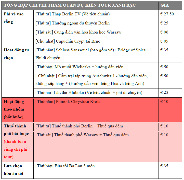 Lưu ý: Danh sách chi phí chỉ mang tính chất tham khảo, tùy thời điểm thực tế, giá sẽ thay đổi. Du khách vui lòng lưu ý rằng một số điểm tham quan phục vụ tùy thuộc vào số lượng khách tối thiểu và điều kiện địa phương. Hướng dẫn viên sẽ thông báo mỗi ngày theo từng hành trình, hỗ trợ du khách mua vé và thu phí trực tiếp bằng tiền mặt (Euro). Du khách có thể tự do quyết định mua vé tham