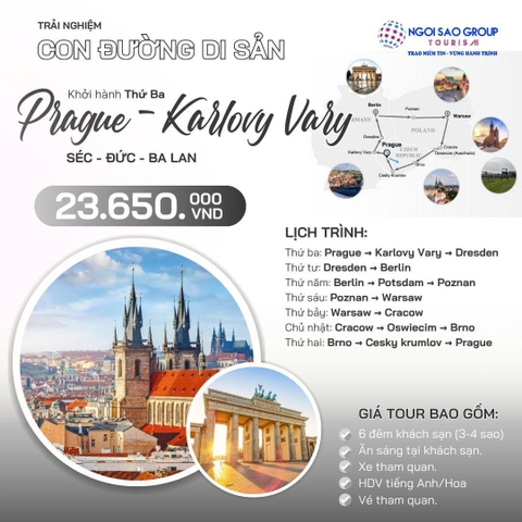 Đoàn khởi hành tại Prague và bắt đầu chuyến hành trình đến tham quan thành phố spa lịch sử mang tên Karlovy Vary. Thành phố này nổi tiếng khi là nơi chứa một lượng lớn hồ nước nóng, với 13 hồ chính và hơn 300 hồ nhỏ. Bên cạnh đó, ở nơi đây, cụ thể là tại khách sạn Grandhotel Pupp - là khách sạn sang trọng nhất ở Đông Âu, còn từng được dùng để làm phim trường cho một số bộ phim nổi tiếng như Casino Royale (007) và Last Holiday. Sau khi ngắm cảnh xong, chúng ta sẽ băng qua biên giới đến nước Đức để khám phá thành phố lịch sử mang tên Dresden. Dresden được tôn vinh là một trong những thành phố đẹp nhất của Châu Âu và còn được ví như " Florence trên sông Elbe." (Florence on the Elbe). Khi đến nơi, chúng ta sẽ tham quan những dấu ấn đặc trưng ở nơi đây như Dresden Frauenkirche (Nhà thờ Đức Bà), bức tường điêu khắc Procession of Princes, lâu đài Dresden (bên ngoài), và quần thể kiến trúc Brühl's Terrace.
