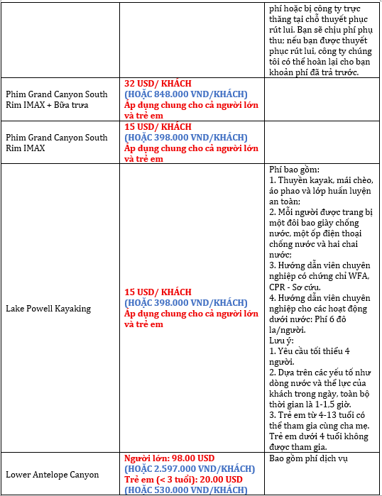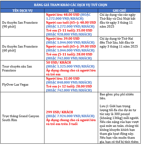 - Vé tham quan các điểm như: Công viên quốc gia Yosemite, Grand Canyon, Horseshoe Bend, Lower Antelope, Hồ Powell, chuyến tham quan Las Vegas về đêm.