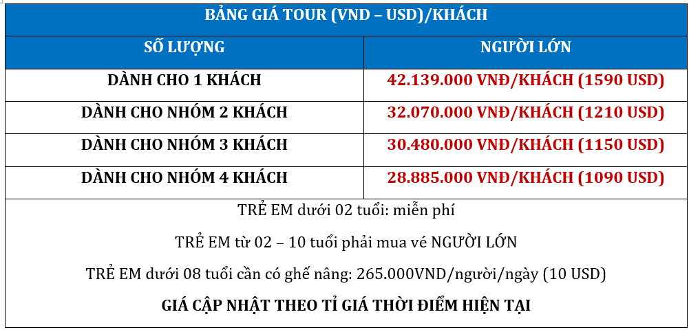 - Tiền tip: 15 USD/người/ngày, bất kỳ trẻ em và trẻ sơ sinh nào sử dụng ghế ngồi trên xe cũng phải trả tiền tip.