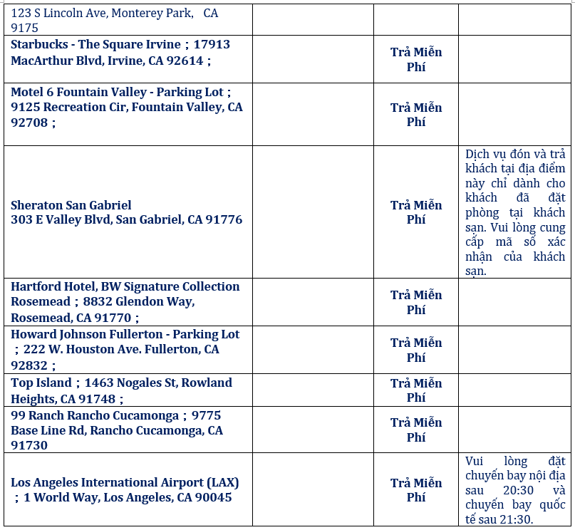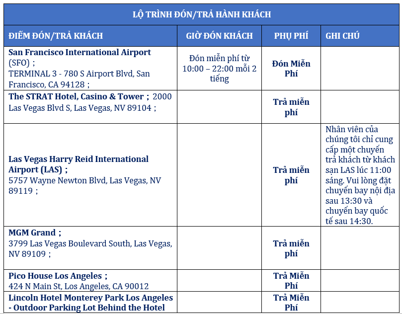 - (Dịch vụ đón miễn phí tùy thuộc vào tình trạng chỗ ngồi, ai đến trước được phục vụ trước. Có thể Qúy khách sẽ phải đợi lâu hơn một chút vào mùa cao điểm.)