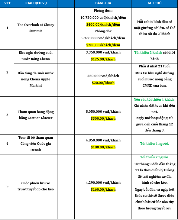 - Nếu có kế hoạch tiếp tục lưu trú tại Fairbanks sau chuyến tham quan, Quý khách có thể đặt thêm phòng khách sạn trước.
