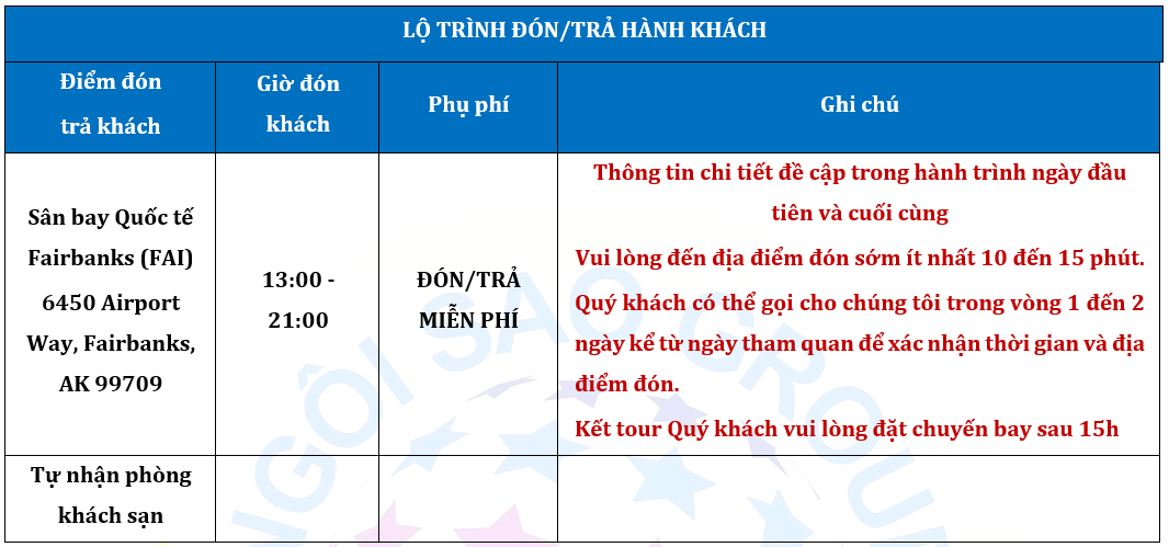 - Dịch vụ đón trả phí từ sân bay Fairbanks đến các khách sạn được chỉ định: