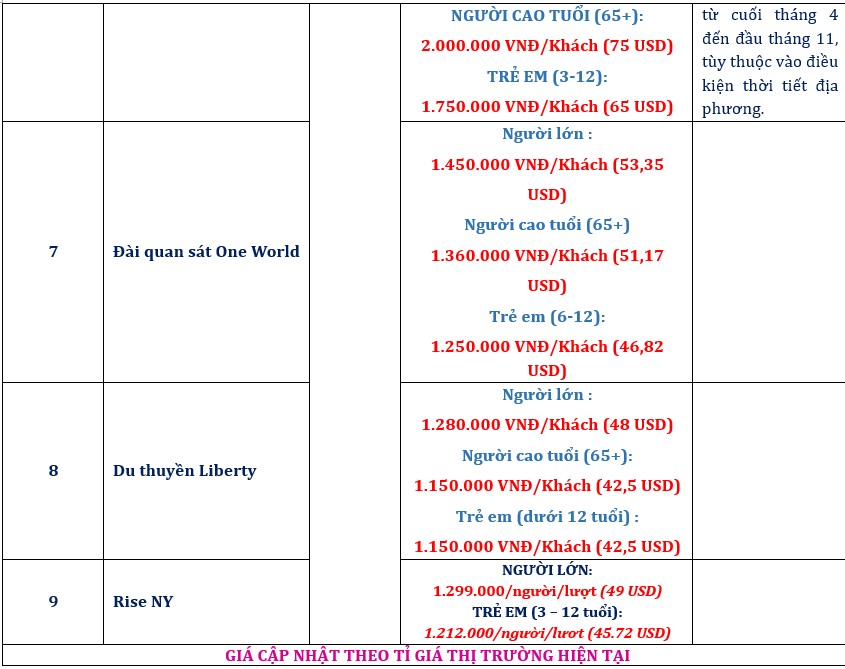BẢNG GIÁ TOUR (VND – USD) |