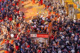 Diễn ra tại Ivrea, gần Turin vào tháng 2, đây là lễ hội ném cam độc đáo mang ý nghĩa tái hiện cuộc chiến giữa người dân và kẻ áp bức trong lịch sử. Với hàng tấn cam được ném đi, lễ hội này tạo nên một khung cảnh vừa hỗn loạn vừa đầy sắc màu.