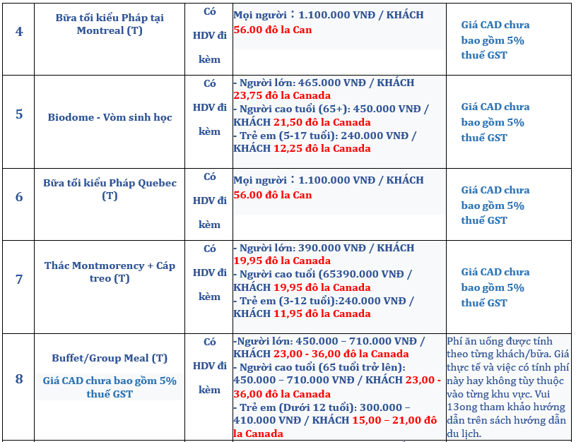 - Tiền tip (~12 USD/người/ngày HOẶC 16CAD/người/ngày, bất kỳ trẻ em và trẻ sơ sinh nào đặt chỗ cũng phải trả tiền tip).